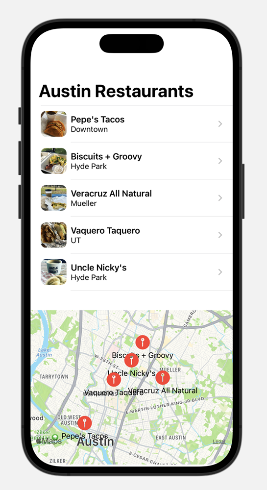 What if we wanted a map for the List page that shows all the restaurants? We can do that! Back in the ContentView add the @State variable for region that controls the map center and zoom level. And add the Map code into the VStack, which will go below the content. This area also provides options for styling the annotations. The frame and padding options at the end apply to the entire map. You can experiment with other options for your desired interface design.