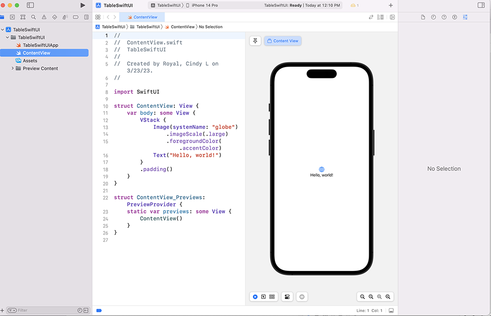 You will notice a simple Hello World display when you view the initial code in the ContentView. That view includes a "var body: some View" that has a VStack (vertical stack) placement of the items. SwiftUI uses VStack and HStack (horizontal stack) commands for relative layout, and you will see those items in the code samples. We will be coding within the "var body" of the view. The items with periods in from of them indicate the various options for the varous items of the interface, like text or images.