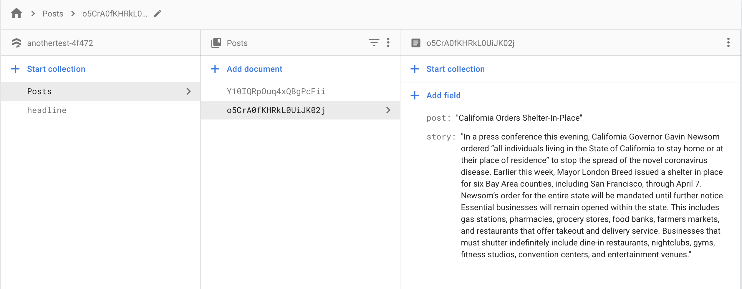 Click on Database in the sidebar if you are not already in that area. Click on Start Collection and name it Posts. You will be asked to include your first Document. Leave the Document ID field blank, because we will use Firestores Auto-ID feature to give each document a unique ID. Your first document will have the field "post". Give it the value of any news headline you would like to use. Choose Add Field to add a second field for "story". This should be the longer story to accompany the headline. Since this is text, leave the type as "string" but you can see other types that are available. Save the Document. Then choose Add Document to add a second post and story in the same manner