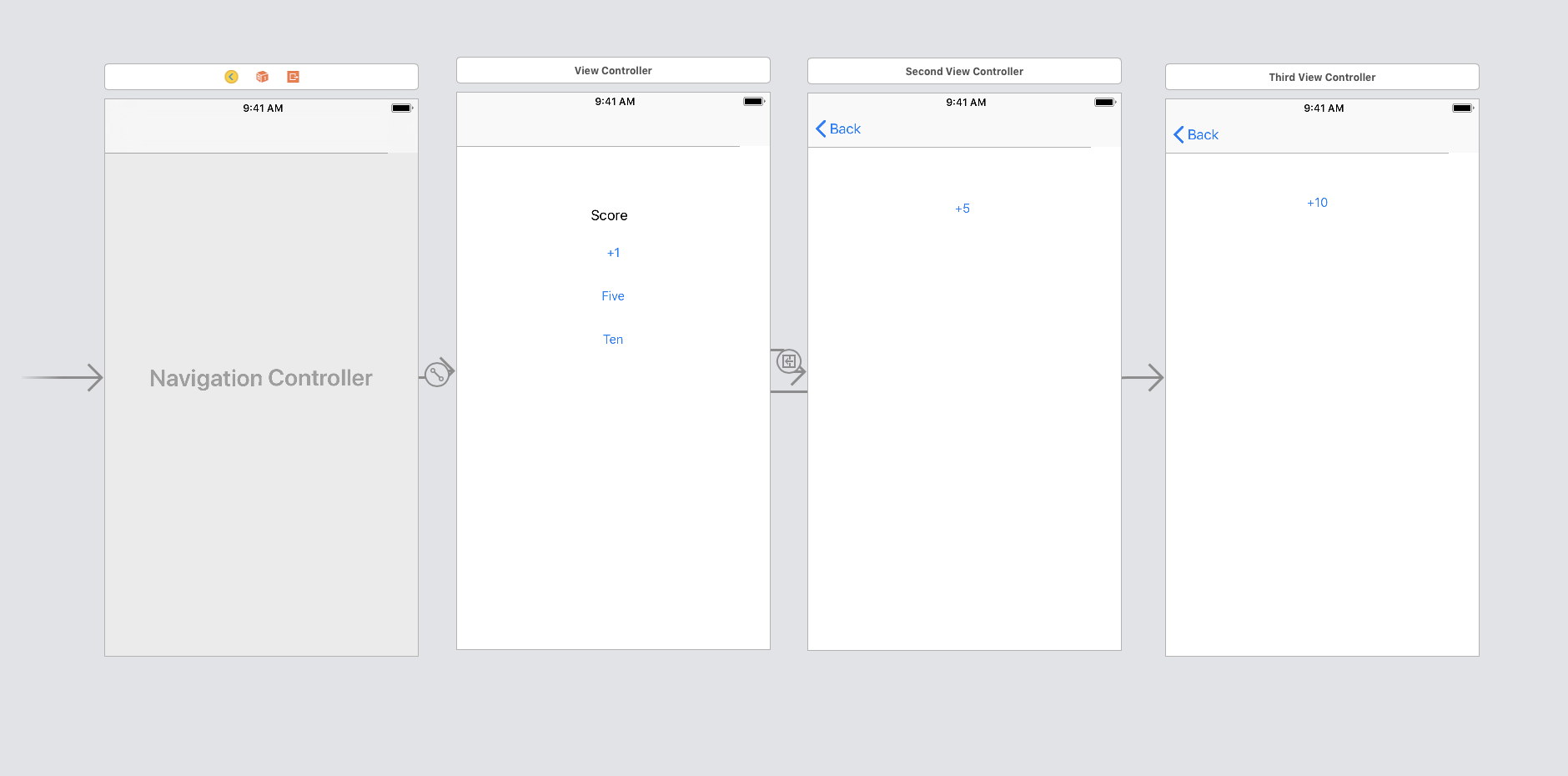Create a back button for each of the scenes above. Instead of progressing forward, we will go back to the initial ViewController after each scene. In the initial ViewController, create buttons to go to each of your other ViewControllers using a simple segue. In the ThirdVC, create a button that adds 10 to the score.